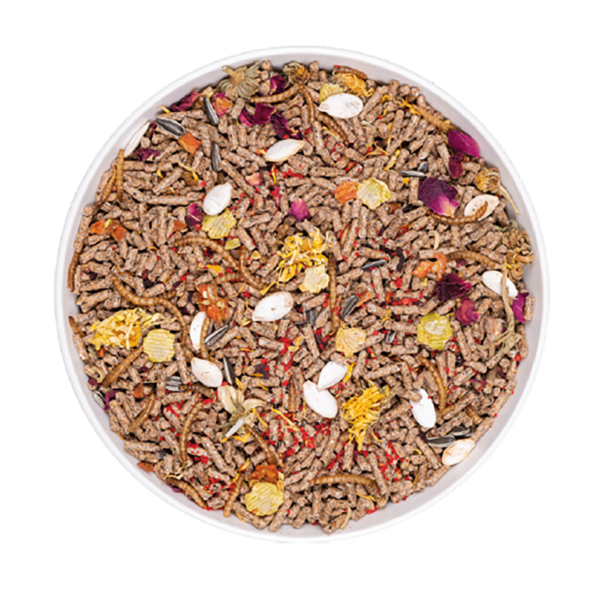 Wheat bran (22.68%), whole soybeans, barley, corn (10.18%), carob pods, wheat, beet pulp (4.5%), cane molasses, white oats, pea flakes (enriched with vitamin C), spelt, whole sunflower seeds, black oats, carrot (2%), soybean oil, mealworm larvae (Tenebrio molitor 1.4%), flaxseed, echinacea, striped sunflower seeds, pumpkin seeds, calendula (Calendula officinalis L.), calcium carbonate, rose petals, salt, brewer’s yeast (source of mannan-oligosaccharides / MOS 0.12%), oregano, thyme, mint, cinnamon, turmeric.